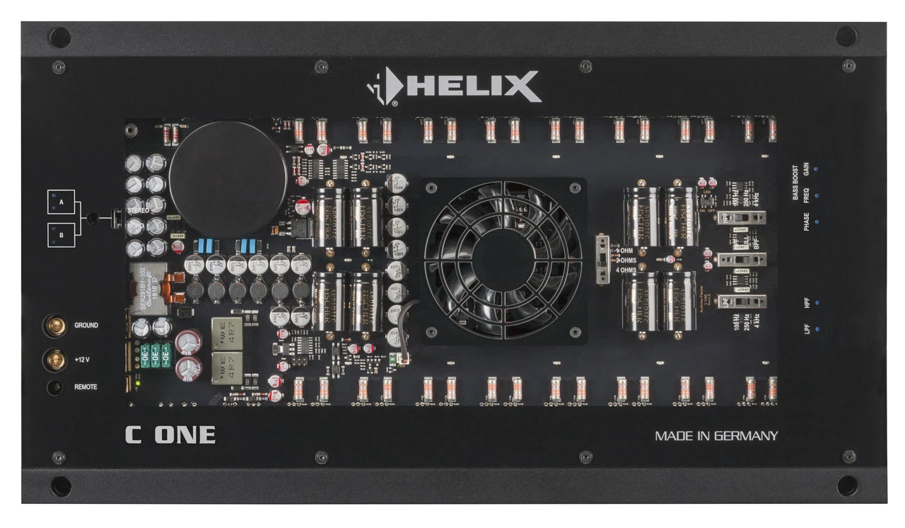 - Das Netzteil im HELIX C ONE Verstärker stellt die interne Spannungsversorgung auch bei kurzfristigen Einbrüchen bis hinab zu 6 Volt sicher. Damit ist gewährleistet, dass die HELIX C ONE auch beim Motorstart voll funktionsfähig bleibt.
