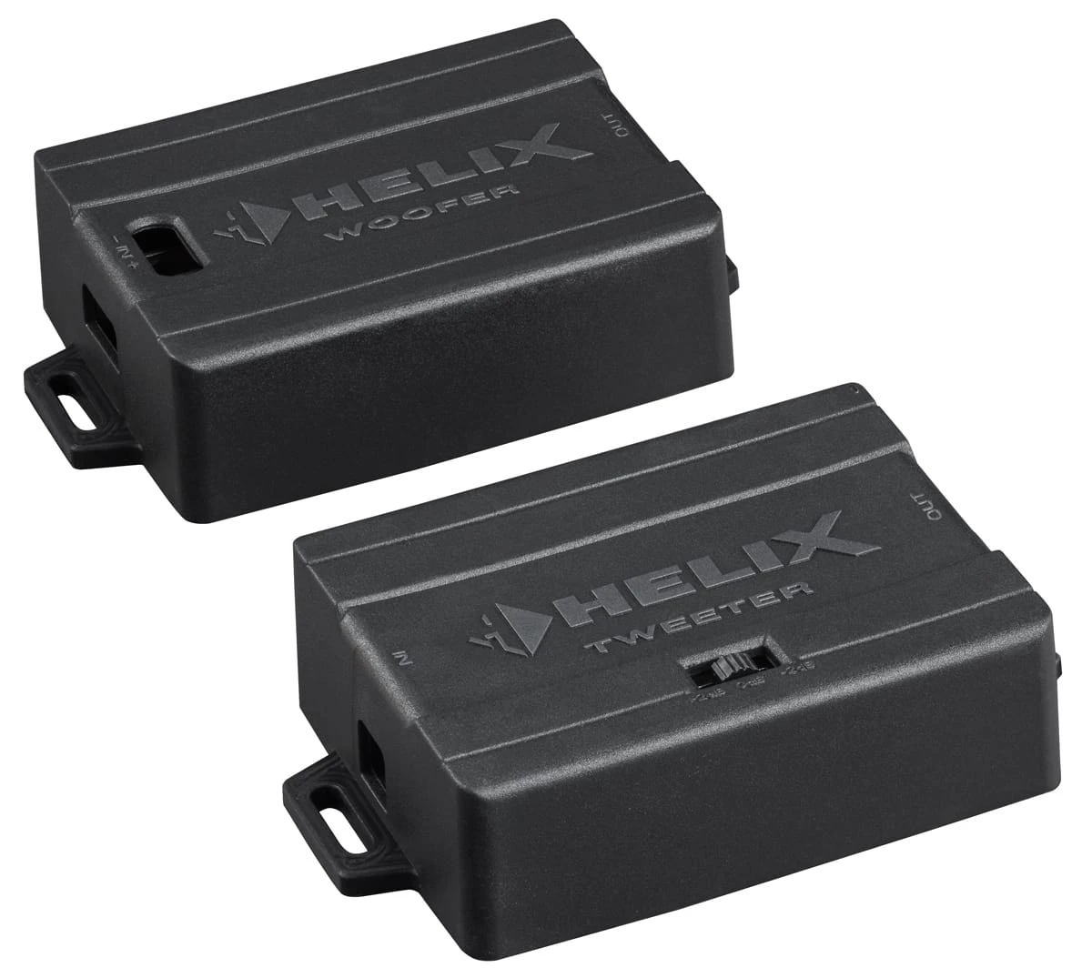 - Separate, zweigeteilte „Flex-Crossover“ Frequenzweiche mit 6/12 dB Flankensteilheit, Sperrkreis und 3-stufig schaltbarer Hochton-Pegelanpassung – perfekt geeignet für den Verbau in Fahrzeugen mit getrennten Einbauplätzen von Hoch- und Tiefmitteltöner