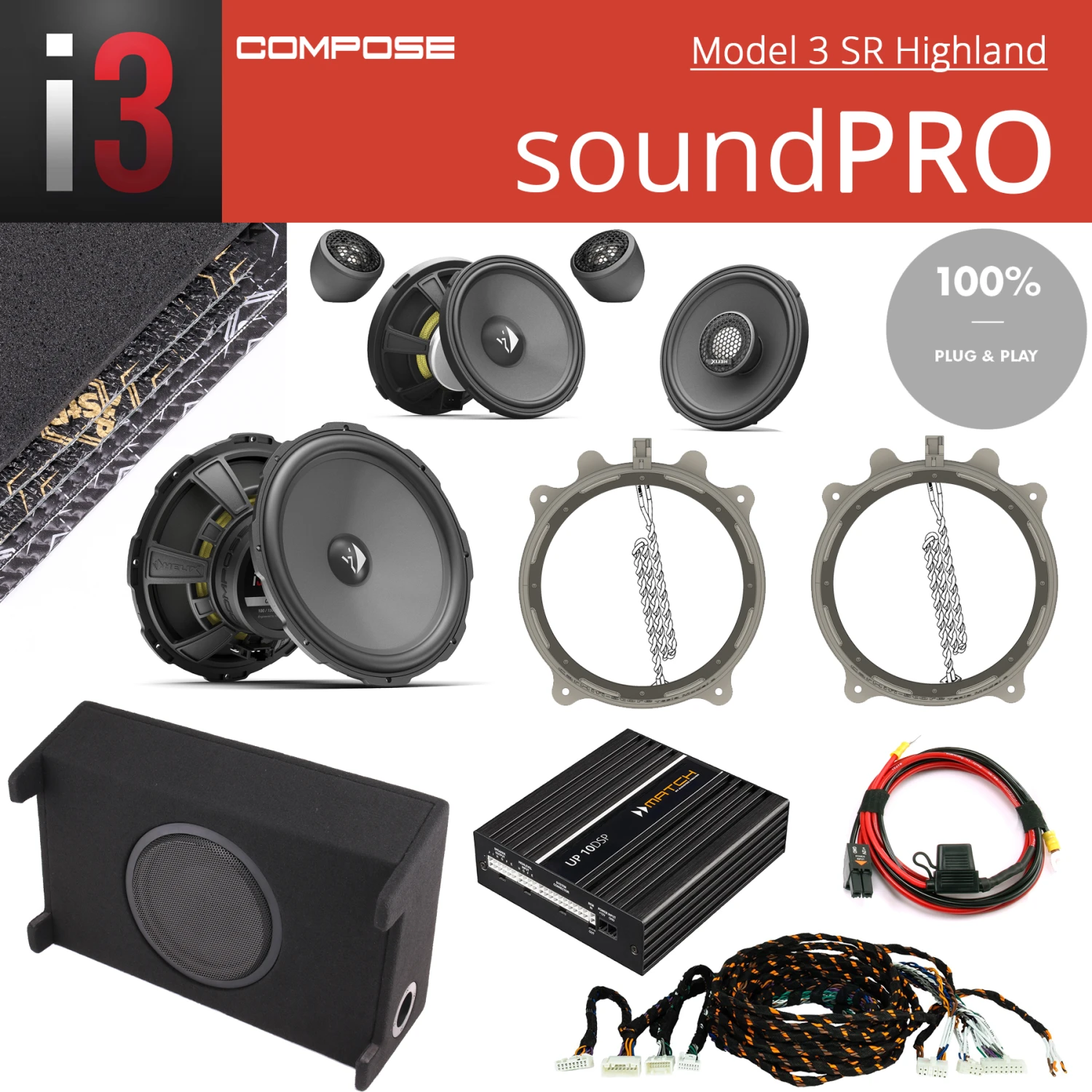 Teslas Lautsprechersysteme sind gegenüber anderen Premiumherstellern schon ab Werk hörbar besser (was nicht unbedingt eine Kunst ist), und auch beim Facelift Highland wurde noch einmal etwas optimiert, trotzdem gibt es viel Luft nach oben, gerade bei einem Elektrofahrzeug und dessen doch ruhigerer „Fahrumgebung“. Und so ein leises Fahrzeug ist doch wirklich eine ideale Basis für ein erstklassiges Sounderlebnis! Auf Basis des Tesla Model 3 SR Highland haben wir drei Soundsysteme entwickelt, wobei dieses soundPRO die goldene Mitte bildet. Durch den Tausch der Frontlautsprecher gegen die Helix Compose Ci3 Hochtöner, Ci3 100 Mitteltöner, den Ci3 200mm Tieftöner sowie dem Center ergänzt um unseren Tesla 25cm Subwoofer und die perfekt abgestimmte Match UP 10DSP Endstufe erreichen wir ein Klangerlebnis, welches selbst dem Premium System die lange Nase zeigt.